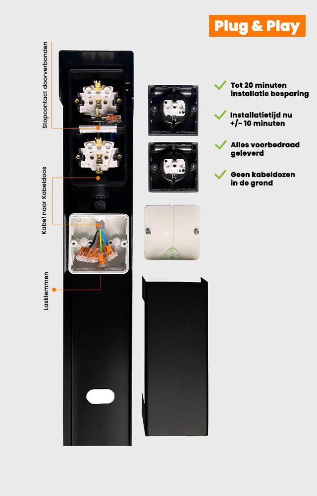 Het enige dat u als hovenier of installateur nog hoeft te doen is het aanvoeren van de grondkabel en het insteken van de juiste kleuren in de Wago klemmen. Meer niet. Op deze manier bespaart u tot vijftien minuten installatietijd per paal. Dat lijkt weinig, maar bij meerdere palen in een project loopt dit snel op.